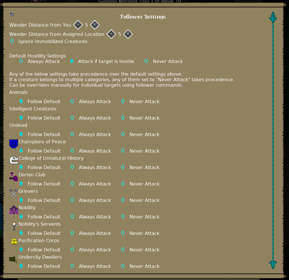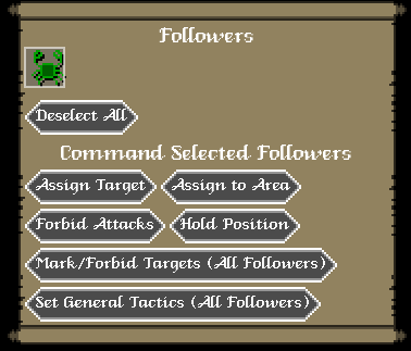 - There’s a new panel that shows you current followers and their health. Hovering over it or pressing the “Issue Orders” button (same hotkey as the one used to assign jobs in the tower) exposes a list of commands you can issue to your followers.