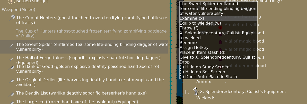 - You can mark an item as no-sell or no-study, which will hide them from those screens; or no-stash, which keeps it in your inventory when you push the “Place all in Stash” button or when you return home with it for the first time.
